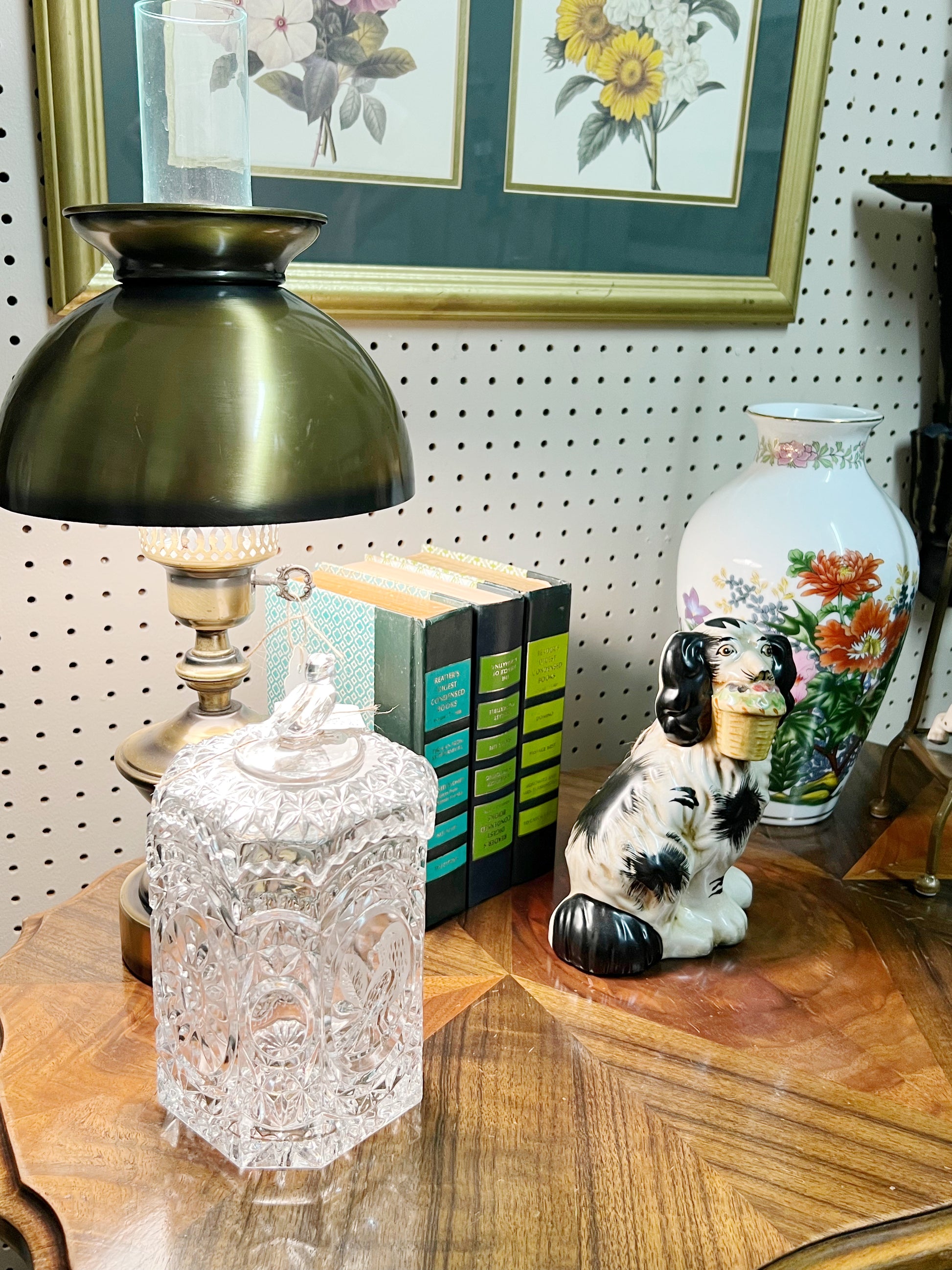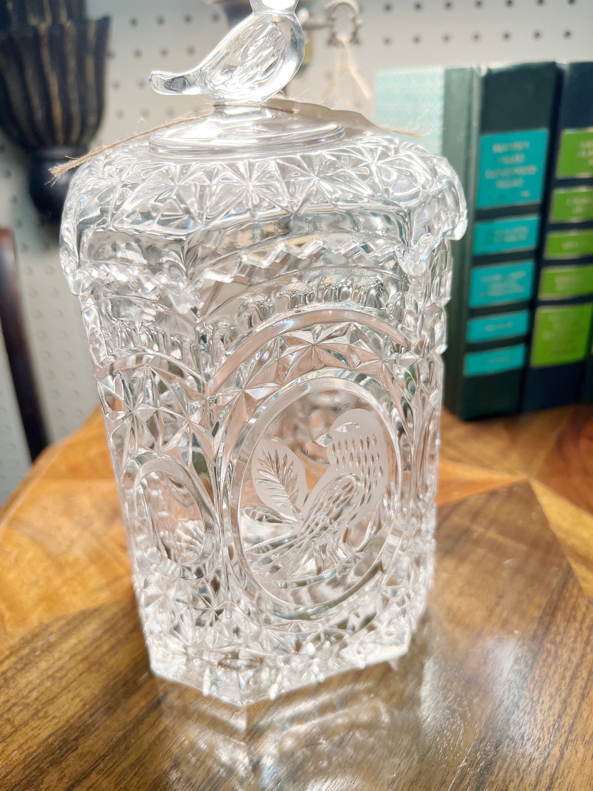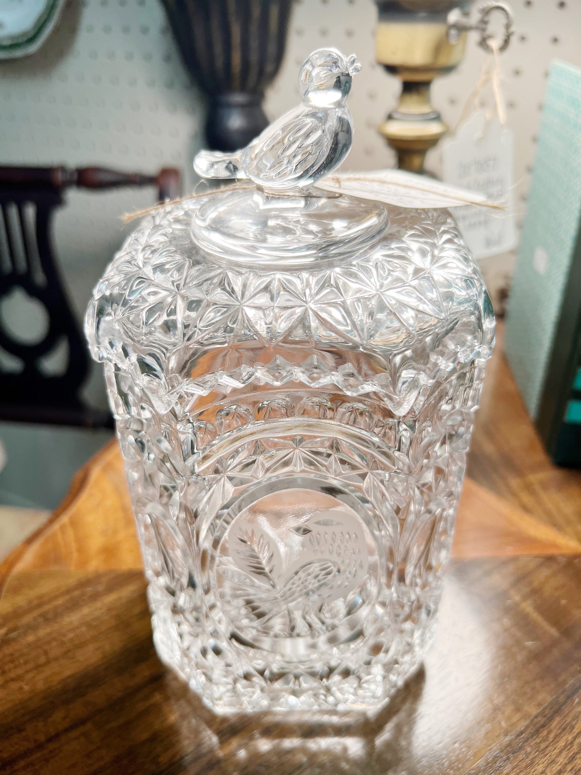 This crystal candy dish is exquisitely elegant. The bird finial on the lid just adds to its perfection.